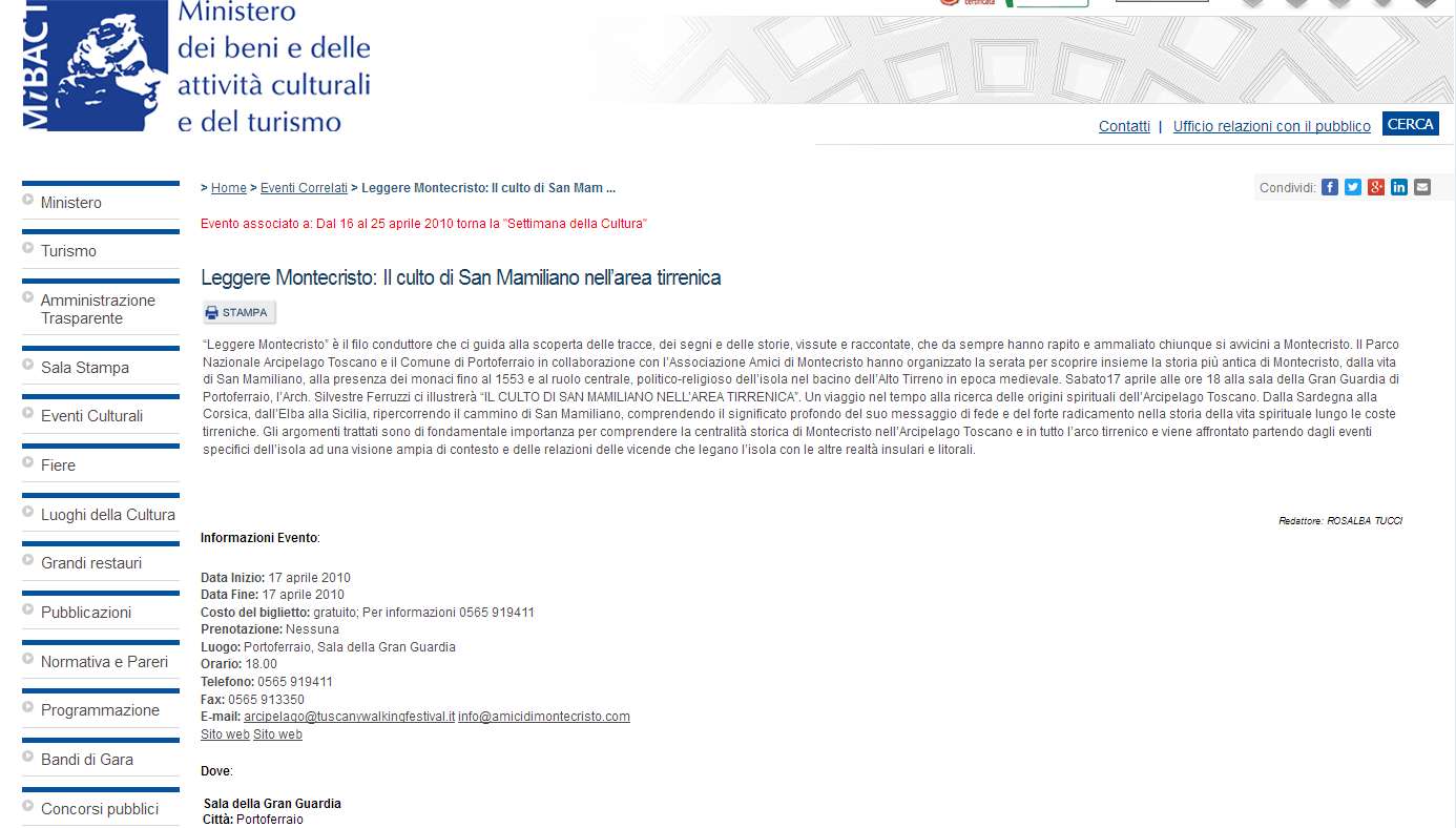 L’evento Leggere Montecristo: il culto di San Mamiliano nell’area tirrenica è stato inserito nel sito del Ministero dei Beni Culturali nell’ambito della XII Settimana della cultura 2010.